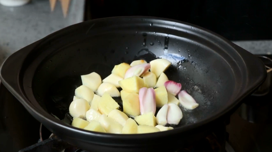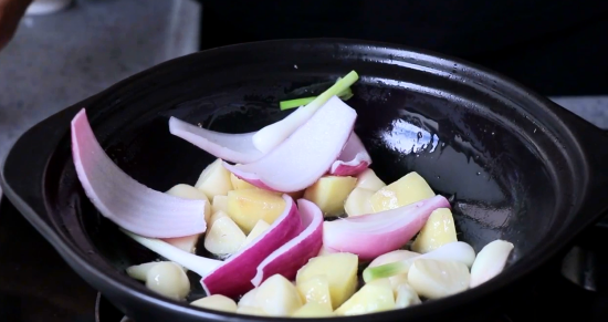第四步:准备一个砂锅,加入少许油,把料头(大蒜,姜)放进去炒香,
