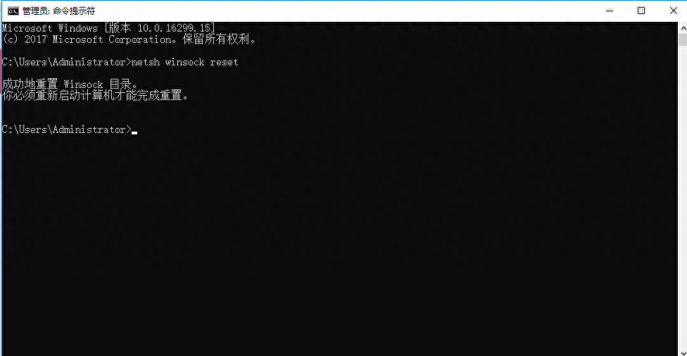 第二步就是在打开的命令提示符里输入命令“netsh winsock reset”,输入完之后按回车键,就完成命令,可以关闭页面了。