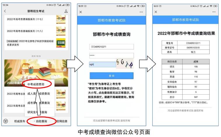 在页面中点击“自助查询”,“中考成绩查询”进入登录界面,输入考生号, 密码(初始密码为身份证号后六位),验证码,点击“查询”按钮。系统经验证无误,将显示考生成绩查询界面,显示考生成绩。