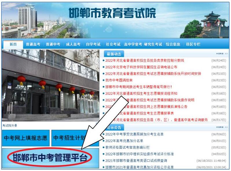 邯郸市教育考试院网站(网址: htp//ww. hdks. net/),点击网页中“邯郸市中考管理平台”,进入中考管理平台。