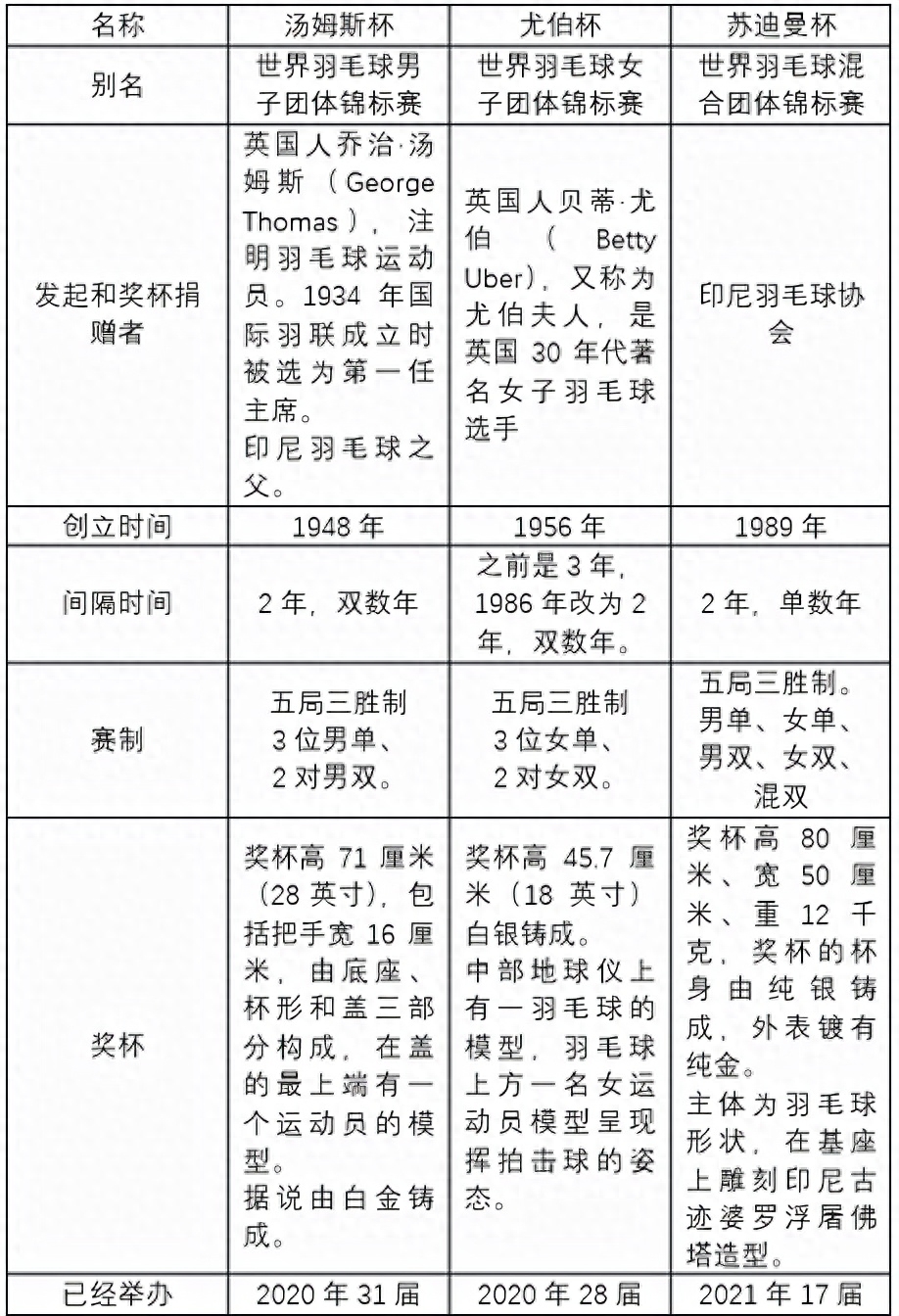 汤姆斯杯、尤伯杯和苏迪曼杯是世界上最高水平的团体羽毛球赛事,他们分别是世界羽毛球男子团体锦标赛、世界羽毛球女子团体锦标赛和世界羽毛球混合团体锦标赛,这三项赛事都是每两年举办一次,汤姆斯杯和尤伯杯一般在同一地点同一时间比赛,又合称“汤尤杯”,逢双年比赛;苏迪曼杯逢单年比赛,由于去年全球疫情的原因,2020年举办的汤姆斯杯和尤伯杯赛事推迟1年,在今年2021年比赛,所以和今年的苏迪曼杯碰上了。