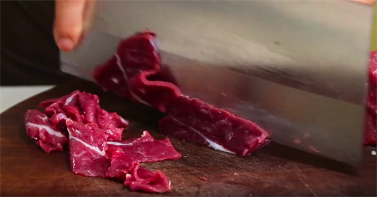 2.牛肉切的时候有技巧,一定要观察一下牛肉的纹路,要逆着纹路切,这样切出来的肉更加的鲜嫩。考验刀工的时候到了,这道菜肉切得越薄越好,可以采用拉锯子的方法来切肉。
