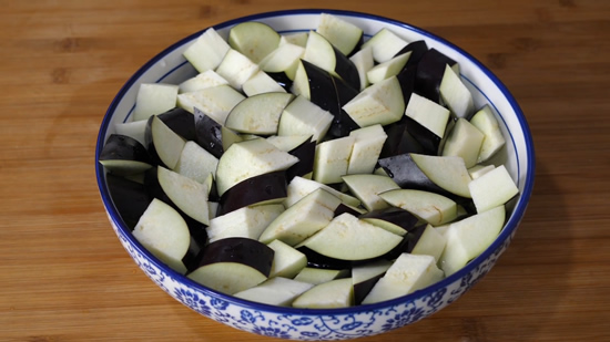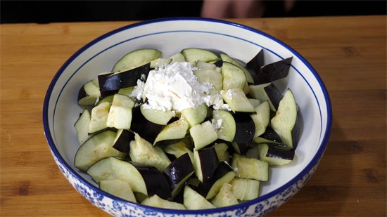 3、在炒茄子之前一定要用盐把茄子腌出水分,挤干水分,在茄子表面裹上一层淀粉,这样烧出来的茄子更爽滑不油腻。