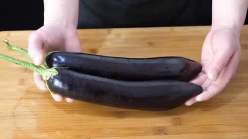 1、准备两根新鲜的茄子,茄子一定要选嫩一点的,如何挑选茄子呢,新鲜的茄子表面很光滑,我们用手捏一捏比较硬,这样的茄子才是新鲜的,而且没有籽,做出来鲜香爽滑更好吃。