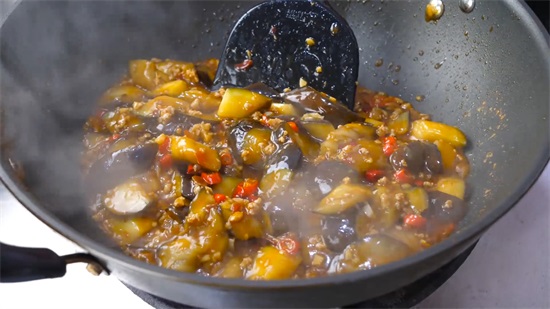 6、三分钟后就差不多了,然后我们用大火收汁,把汤汁收至粘稠,让汤汁包裹在茄子上,这样更加入味好吃,最后出锅前撒上葱花,翻炒均匀就可以了。这样一道美味的肉末茄子就做好了,鲜香好吃开胃下饭,不吸油不油腻。做法很简单,出锅全家人都爱吃,喜欢的朋友赶紧试试吧。