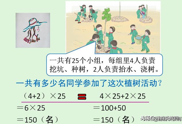 再举一个例题:一共有25个小组,每组里4人负责挖坑、种树,2人负责抬水、浇树。一共有多少名同学参加了这次植树活动?