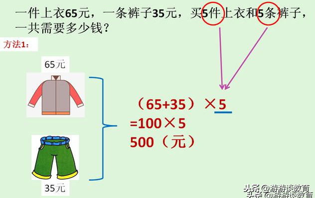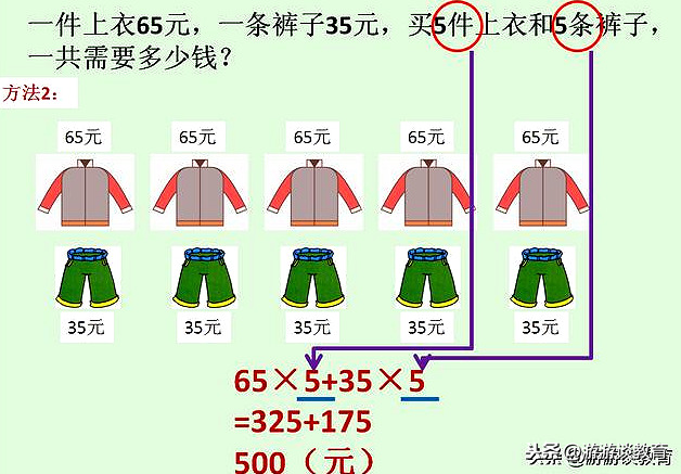 解决这个问题,有两种方法:一是先算出一件上衣和一条裤子一共需要多少钱(也就是先算一套衣服的价钱),然后再乘5(买了5套),两步就能算出总价,列成综合算式是:(65+35)×5=100×5=500(元);二是分别算出5件上衣的价钱,和5条裤子的价钱,再把两个钱数加起来,就是5套衣服的总价了,这个方法得用三步计算,列成综合算式是:65×5+35×5=325+175=500(元)。