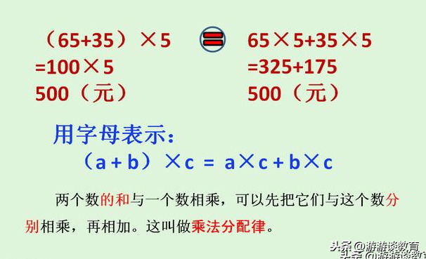 由于这两种方法都是计算5件上衣和5条裤子的总价的,结果都是500元,所以,可以用等号把这两道综合算式连接起来,即:(65+35)×5=65×5+35×5。这其实就是乘法分配律的运算形式,如果用字母a表示上衣的价钱65元,用b表示裤子的价钱35元,用c表示购买的数量5,那么,上式就变成(a+b)×c=a×c+b×c。用文字表述,即:两个数的和与一个数相乘,可以先把它们与这个数分别相乘,再相加。这叫做乘法分配律。