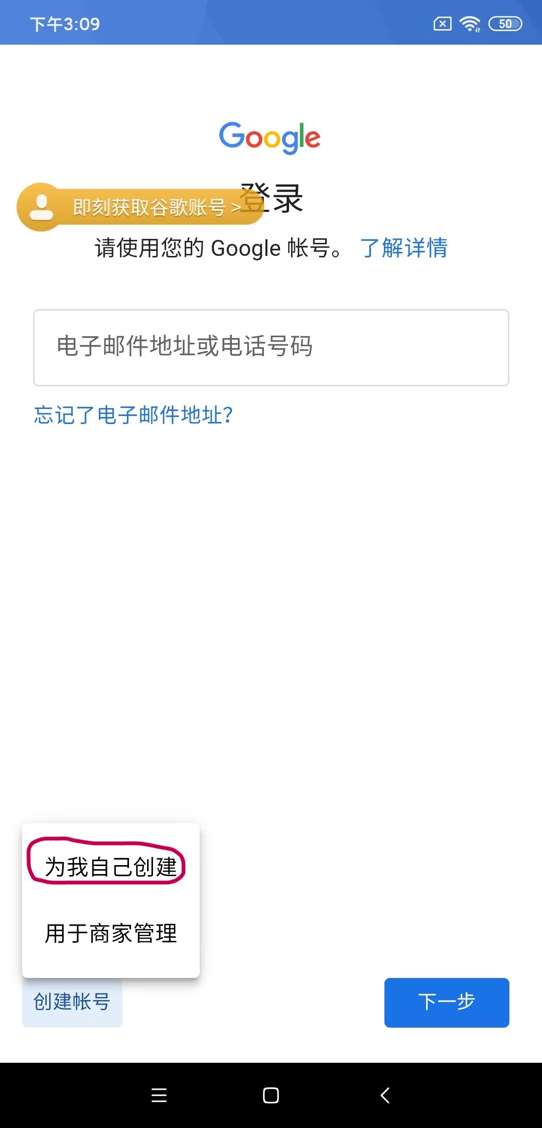 6、点左下角创建谷歌账号,如果在这个界面没有出现创建账号,就点忘记电子邮件地址,然后点一下手机返回键就能看到了。