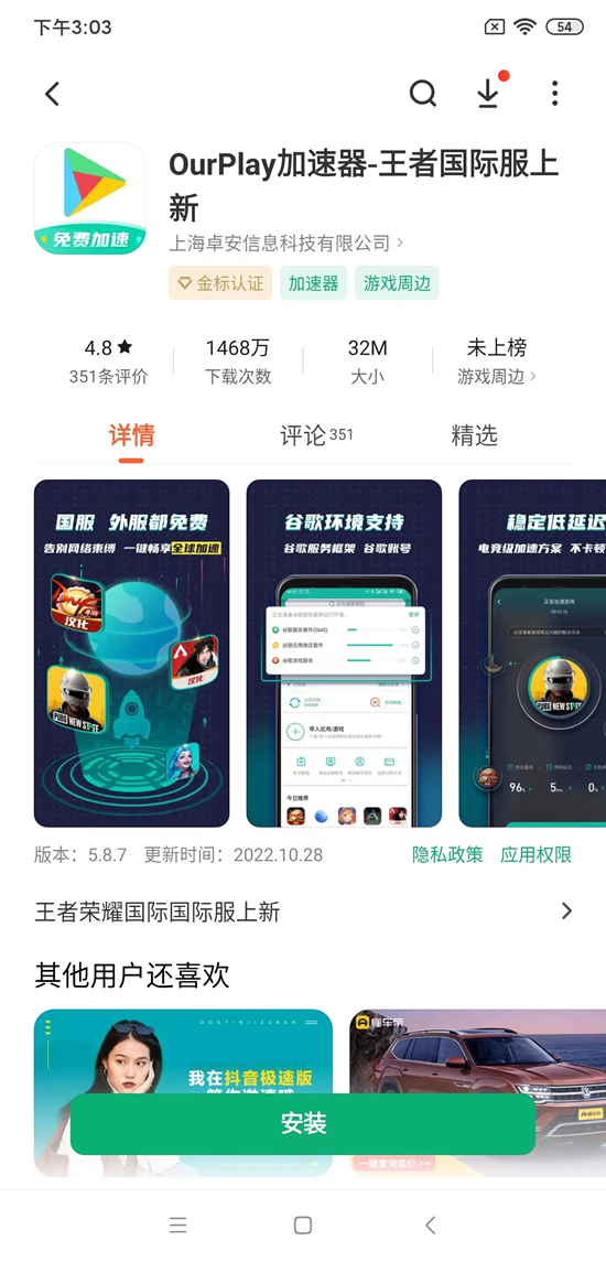 2、在手机上下载一个游戏加速器名字叫ourplay,如下图