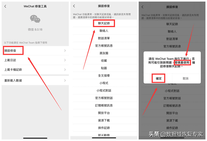 在“微信修复工具”的页面点击“损毁修复”,再选择“聊天记录”,最后点击“确定”即可。