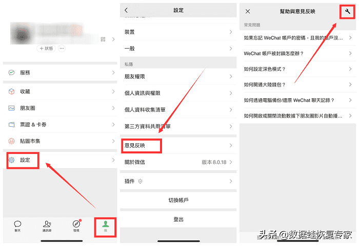 打开微信中的“我”,点击“设置”,再点击“意见反馈”,最后点击右上角的小工具图标。