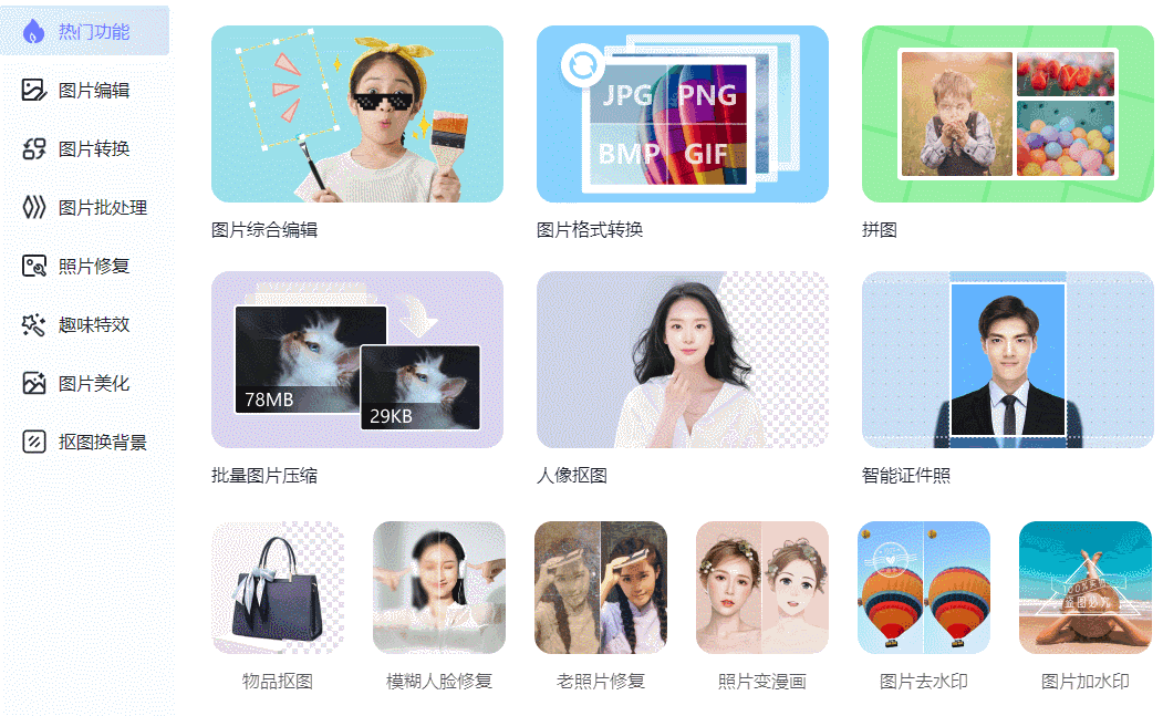 图片编辑、图片格式转换、证件照制作、图片变漫画、图片加水印、甚至是各种照片修复