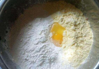 2、将白面和玉米面放在一起,然后加入鸡蛋黄进行搅拌,搅拌均匀即可;