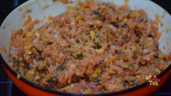 第四步:将五花肉去皮,然后切成小块,再跟田螺肉一起剁碎成肉末,剁好之后装盘子里面,加入半茶匙食盐,加入1汤匙胡椒粉,加入1小勺淀粉,然后顺时针搅拌均匀,搅拌至肉末起胶。
