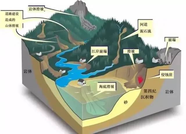 滑坡是指山区斜坡上的土体或岩体,受降雨、地震、人类工程活动触发下,沿着一定的软弱面,整体或局部顺坡向下活动的自然现象。滑坡整体起动前,一般会在斜坡表面出现裂缝,局部会发生小规模的滑塌现象,滑坡上的房屋、道路也会处理裂缝,有时动物也会出现异常反应,这些都可能是滑坡前兆,应该特别注意,尽快离开滑坡影响区域。滑坡整体起动后的运动速度非常快,千万不要顺着滑坡运动方向逃生,应向滑坡两侧逃生。