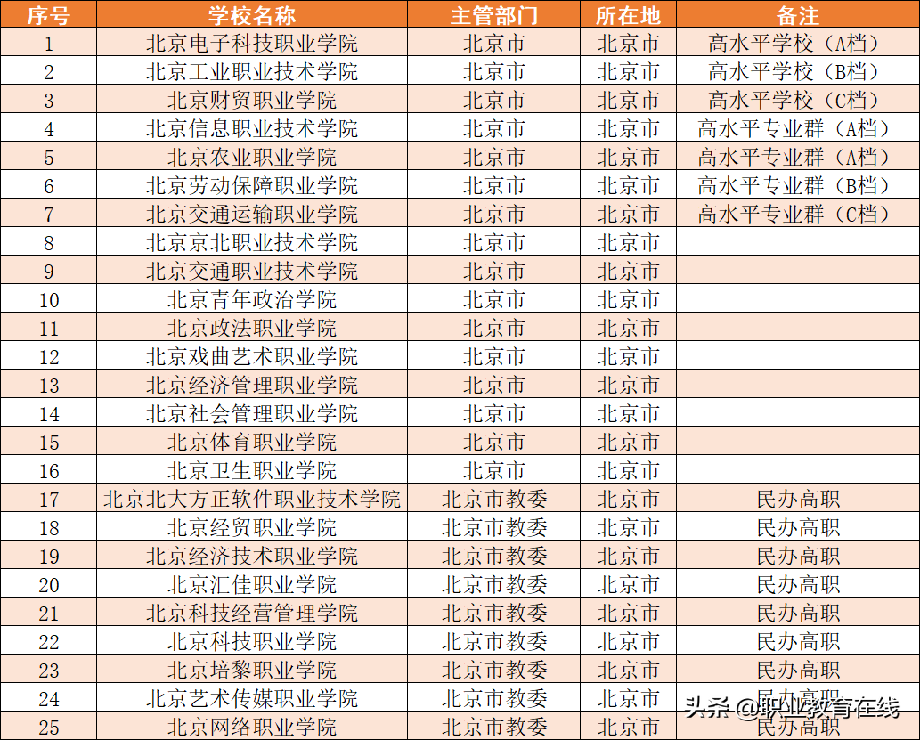 北京共有25所职业院校,其中公办高职16所,有7所入选国家双高计划,9所民办高职。北京至今没有一所本科层次的职业大学,即使办起来,也前途未卜。