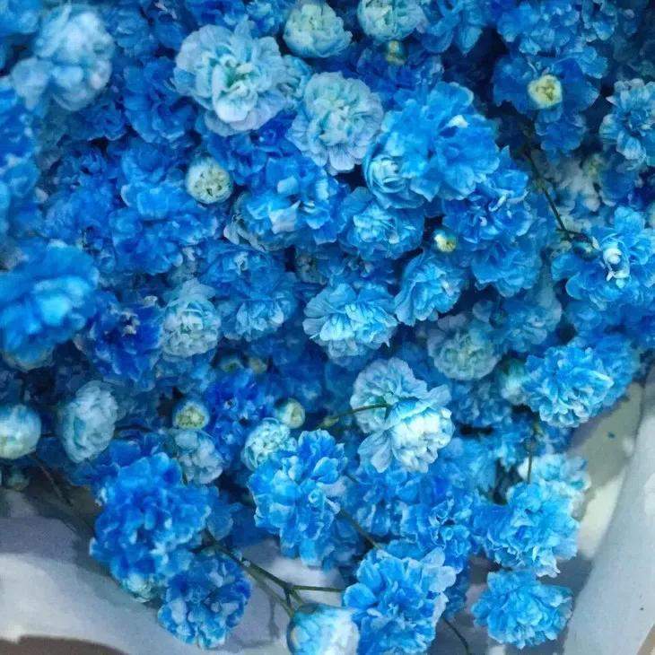 满天星~蓝色的满天星的花语是梦幻梦境、纯粹的爱情、思念、奇迹等。蓝色本身是浪漫梦幻的颜色,满天星又像星星一样,所以代表着爱情中的梦幻和纯粹。蓝色满天星像满天的繁星,看到它好像看着星星寄托思念。它还寓意着奇迹,赠送给别人说明对方是你心中的奇迹。