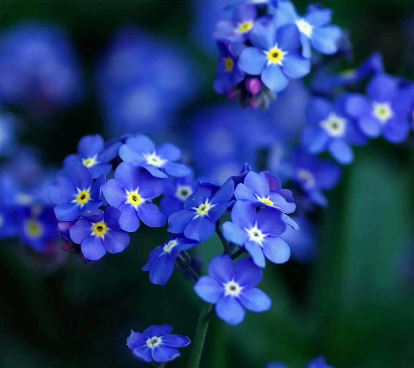 蓝色勿忘我~花语是永恒不变的爱、真实深情的爱和不要忘记我,勿忘我代表着爱情和想念,而蓝色属于植株常见的颜色,象征着平凡却又美好的爱情。