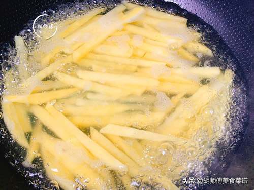 3、炸薯条时,不可以大火炸,必须全程中小火炸,因为中小火炸,能使土豆里面的水都完全蒸发,从而使土豆吃着更加脆爽。