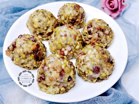【食材】:绿豆,江豆,红枣,葡萄干,糖,牛奶,糯米粉。