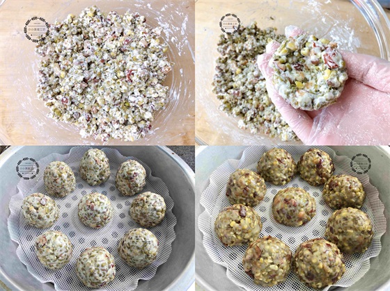 3、搅拌成可以抱团的程度后,用手揪一块团成窝头状,然后放入蒸屉中大火蒸制15分钟即可。