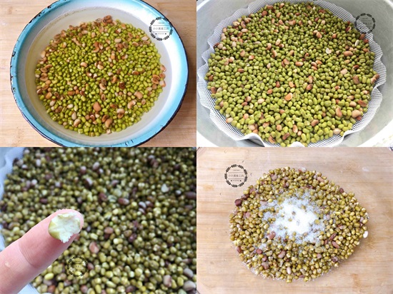 1、绿豆和江豆洗净后浸泡一晚,然后放入蒸屉中蒸制成熟,接着加入适量白糖搅拌均匀。
