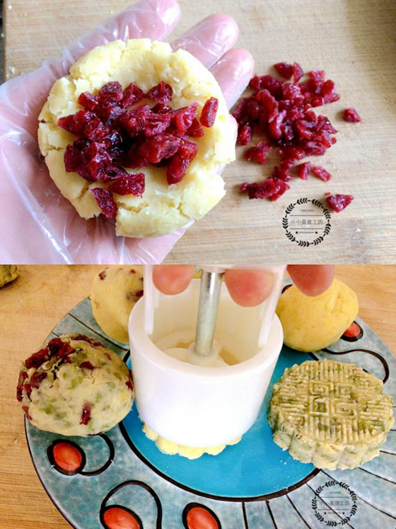 3、可以根据自己的喜好放入葡萄干或蔓越莓干,左后放入模具中压出花型即可。