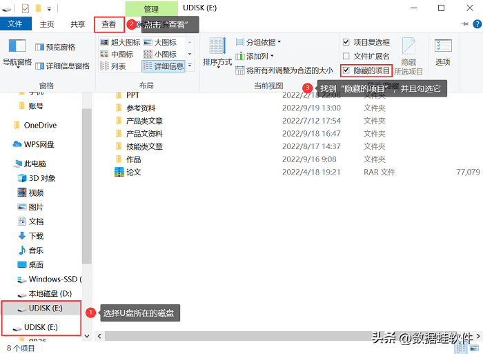 可以在电脑查看你的u盘属性,里面的数据是被占用的情况,但是又找不到你要的文件,那这就可能是你的u盘文件被隐藏起来了。u盘如何修复?这时,打开电脑桌面的“此电脑”,选择u盘所在的磁盘。在页面点击“查看”,选择“隐藏的项目”来恢复隐藏的文件。