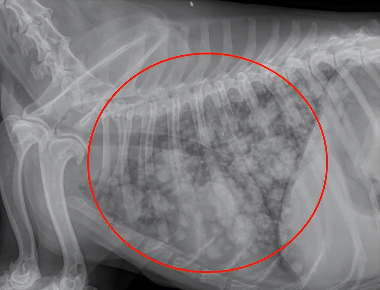 希望每个主人带狗狗检查时不要呈现这样的照片!下面这张图就是乳腺癌肺部转移X光照片。