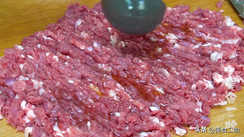 第三步:取适量羊后腿肉先切成薄片,然后剁成肉馅,边剁馅边加凉晾的大料水,剁到没有大块的肉片之后加一些葱和姜,期间也要不断的添加大料水,剁到肉馅细腻非常湿润的状态,按照自己的口味添加食盐和五香粉,其他的调味料不要添加了会影响羊肉的鲜味,把调味料和羊肉馅剁匀盛到碗里备用。