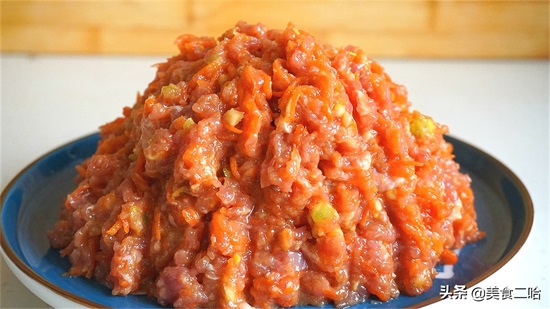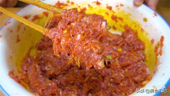 第四步:准备一些胡萝卜洗干净,去皮之后擦成细丝,把细丝放到纱布上面,挤出胡萝卜汁,然后把萝卜丝和肉馅拌匀,挤掉的汁水不要浪费和肉馅拌在一块,最后炸一些花椒油浇上去,羊肉馅就做好了。