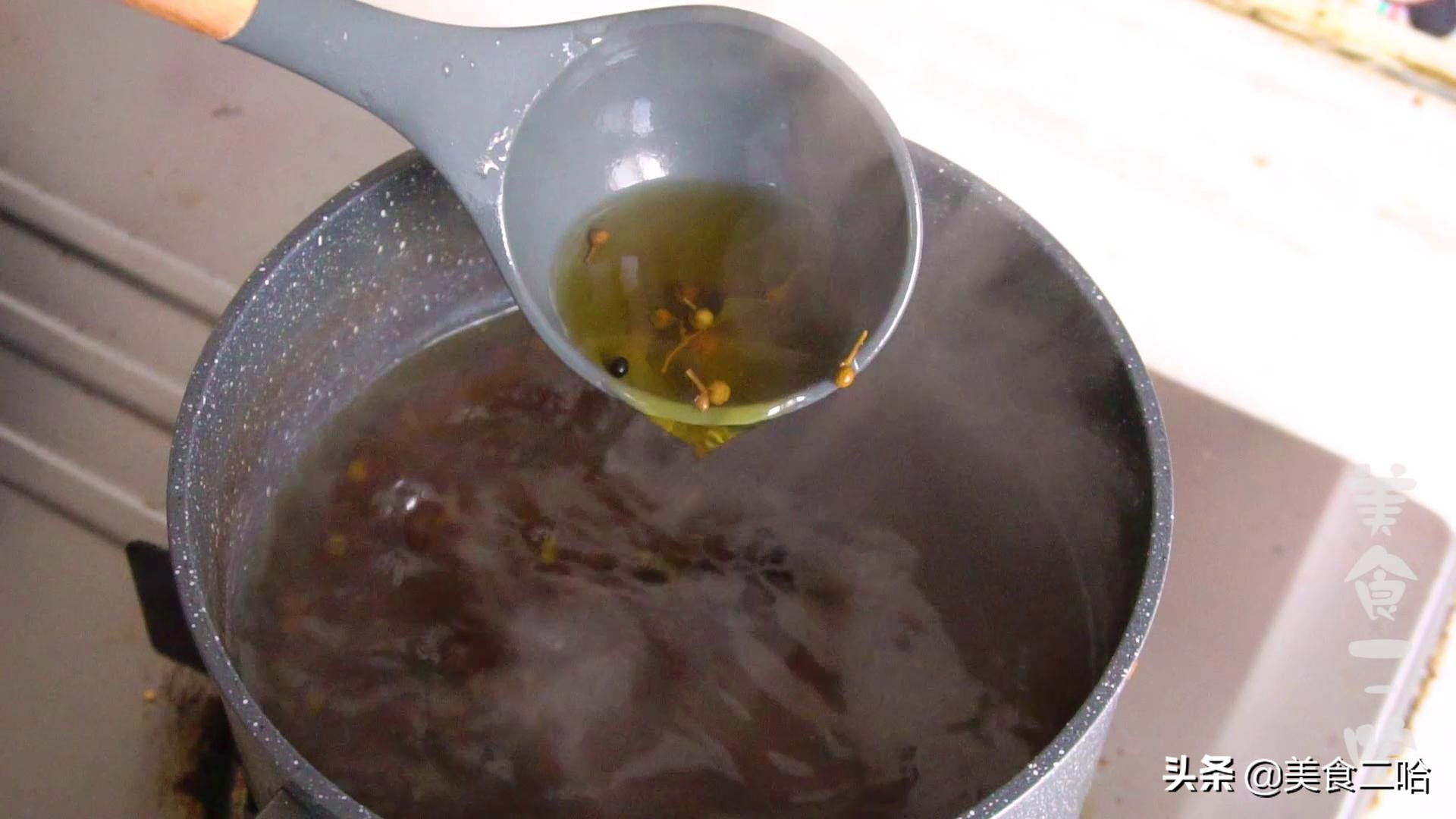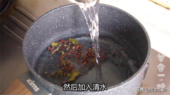 第二步:剁肉馅之前先在锅里一些打馅儿的料水,水里面添加几颗花椒、八角、少许橘子皮大火烧开煮15分钟自然放凉。