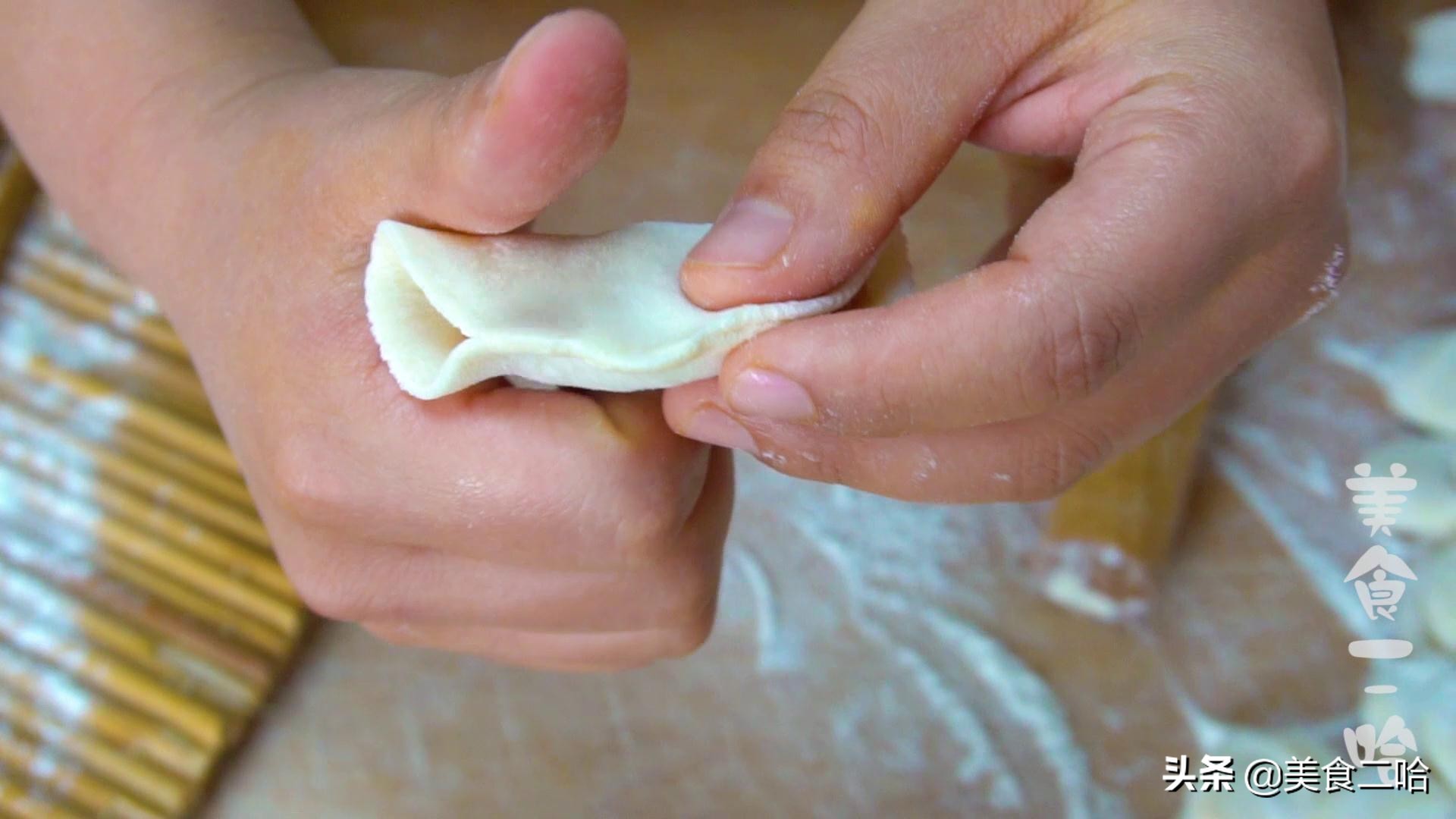 第五步:面团饧好之后不用揉面了,直接滚长条下剂子,然后擀饺子皮,中间包上羊肉馅,收口处捏紧饺子就做好了。