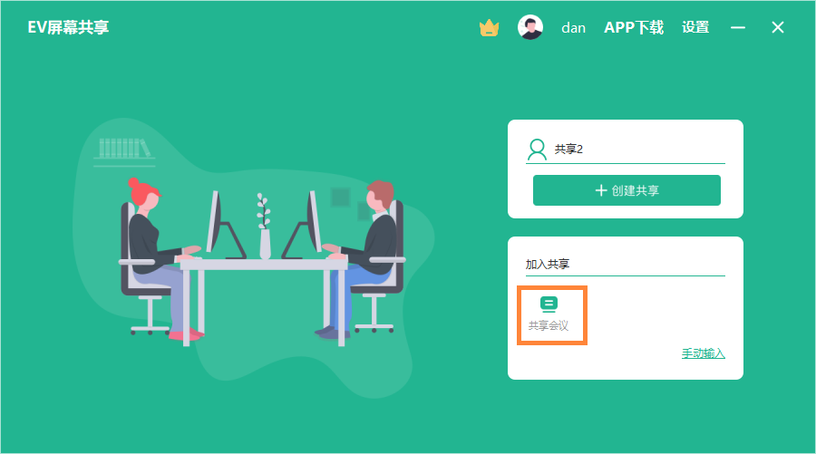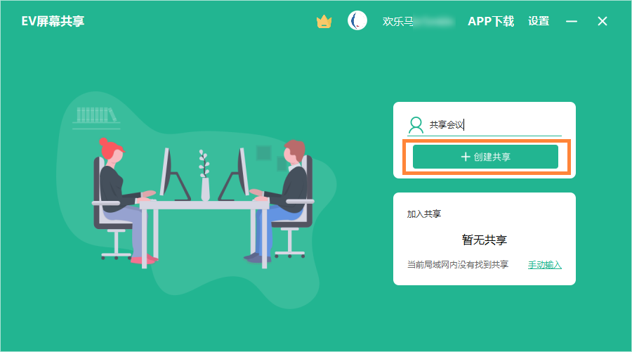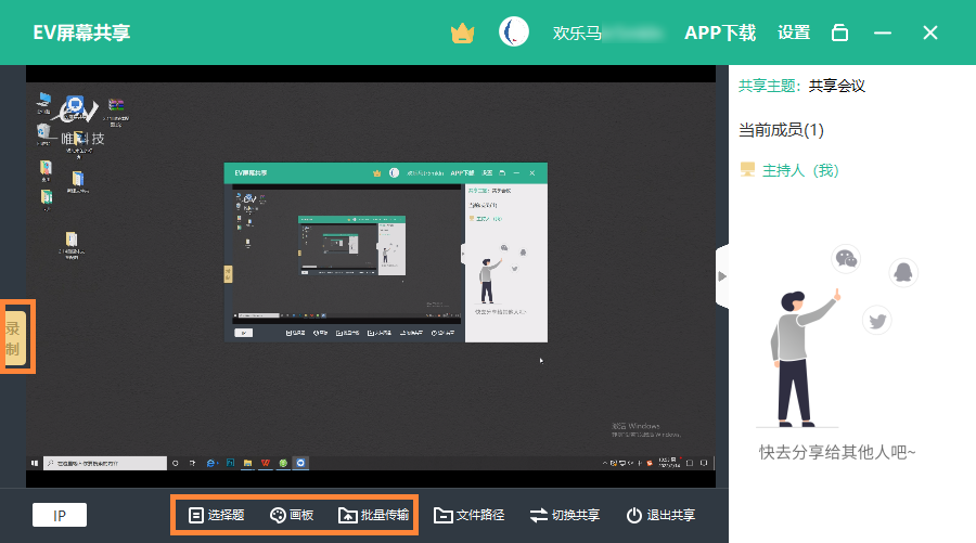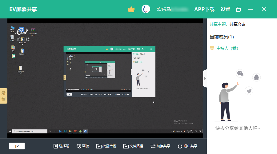 1.电脑打开EV屏幕共享,输入该会议的主题,比如共享会议,完成后点击创建共享。