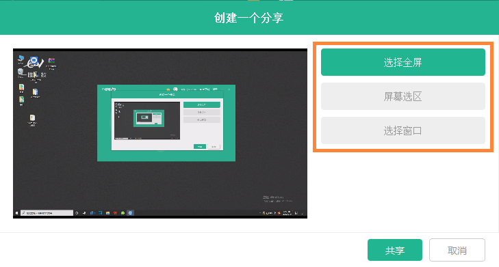 2.选择分享的屏幕是【全屏】、【屏幕选区】或【窗口】。