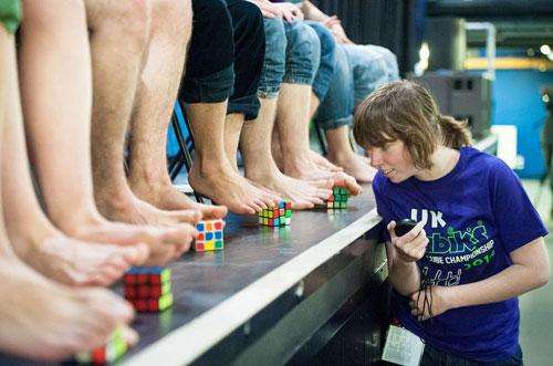 l 脚拧:虽然听起来有些不可思议,但确实有人践行过。截至目前,魔方脚拧的世界纪录保持者为波兰的Jakub Kipa在2016拉多维斯科魔方公开赛创造出20.57秒的惊人成绩,国内脚拧纪录则由杜海川保持,为30.32秒。