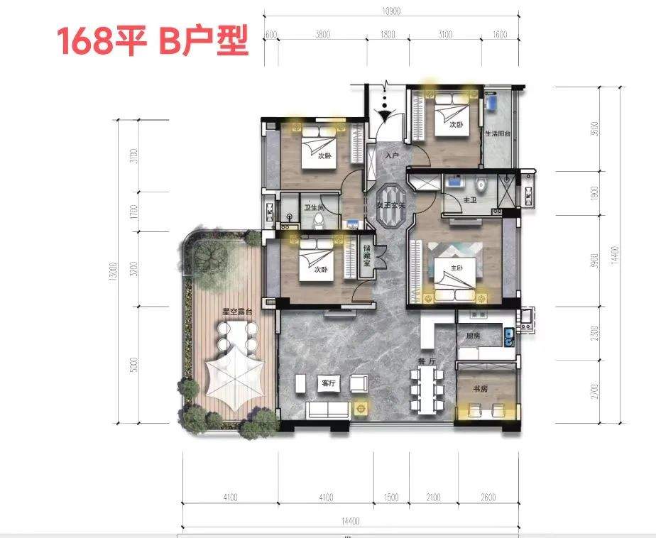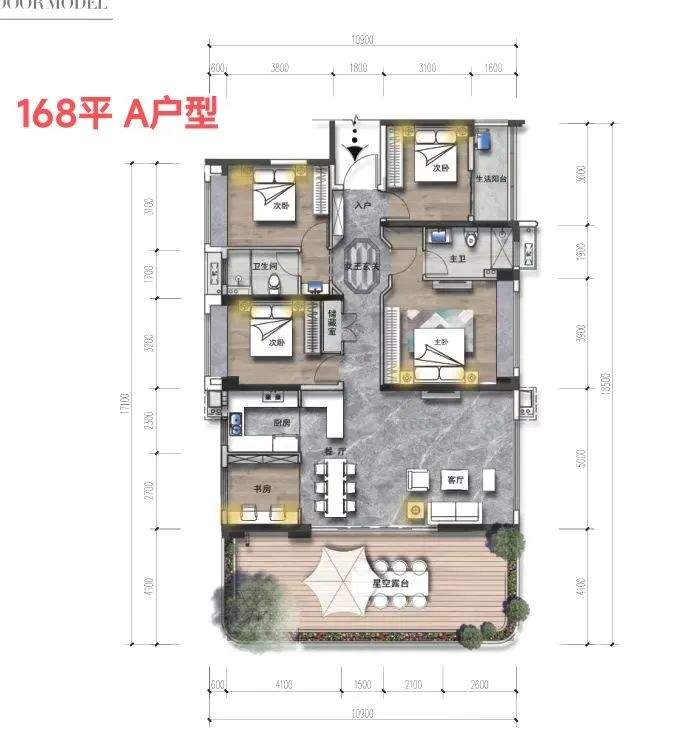建面168 A户型,4+1房2厅2卫(+1为书房)。