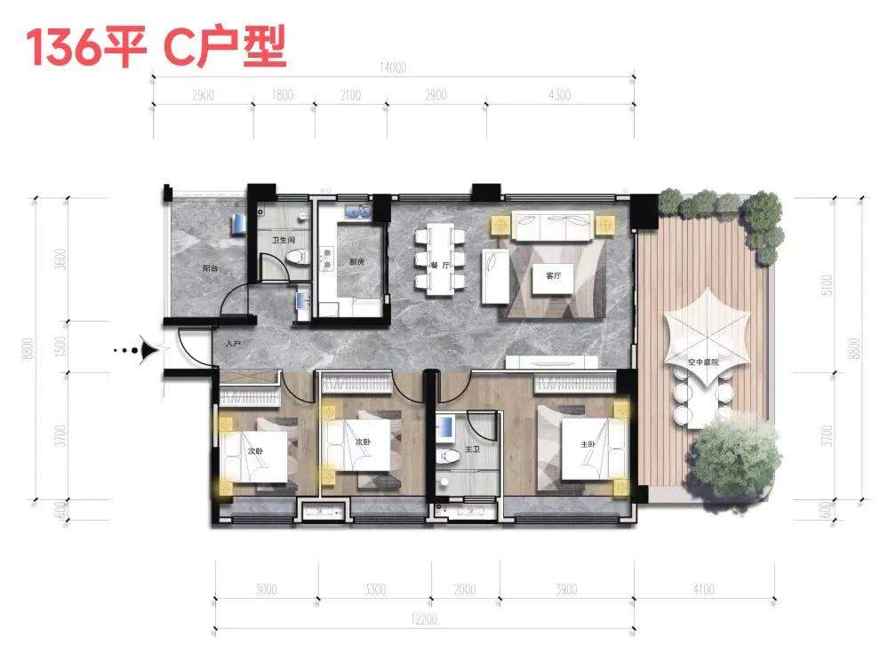 建面136 C户型,3房2厅2卫。