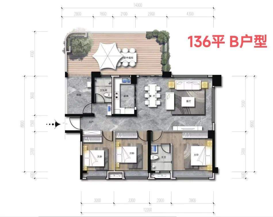 建面136 B户型,3房2厅2卫。