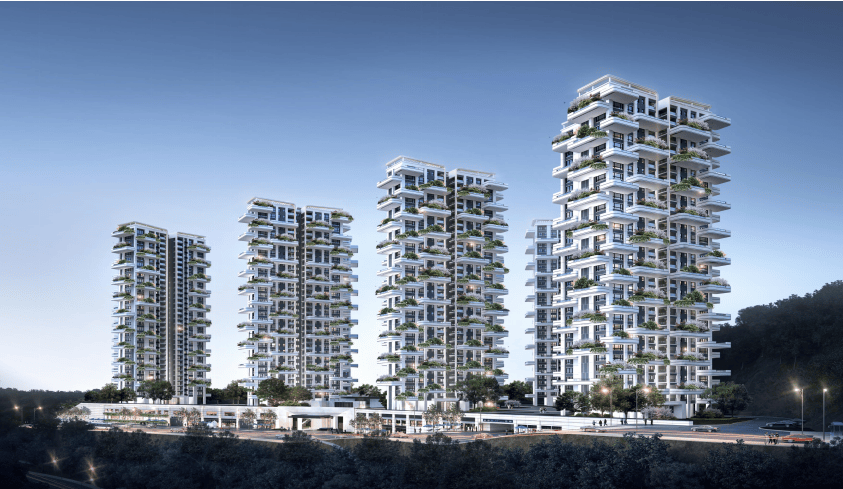 “花语墅”的产品为“第四代”建筑设计,也就是大家比较熟悉的带大露台和垂直绿植的住宅。