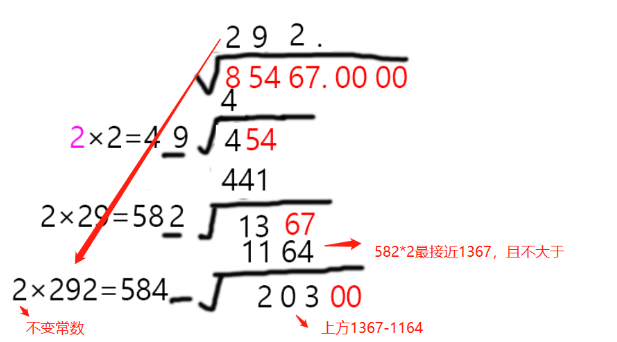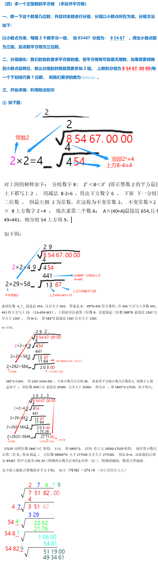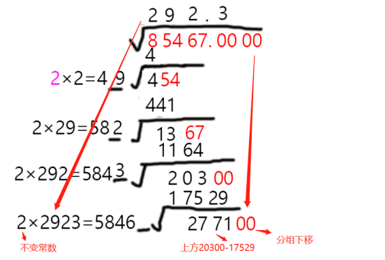 17529 由四位数584C×C 所得, C=3, 即5843*3。 2771 有上方20300-17529所得, 现在算小数点后第二位D , 得D满足 : 五位数5846D*D 小于277100且不大于277100, 得出D=4,由此我们已得出85467 的平方根为292.34(精确到小数点后两位),可举一反三,精确的越细,数值计算越难。