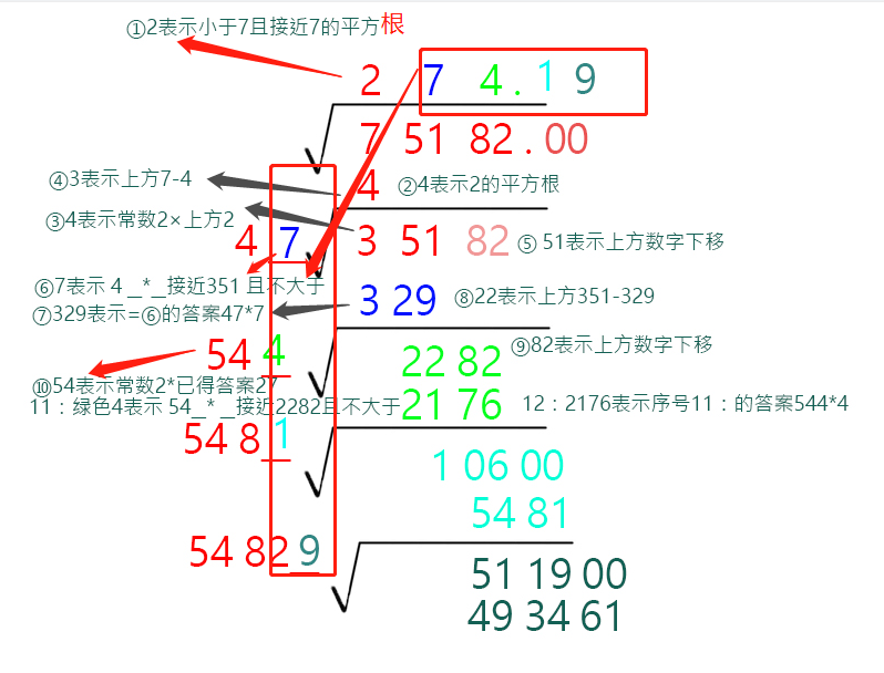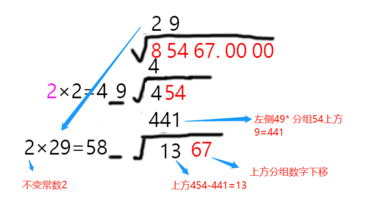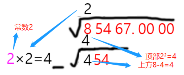 对上图的解释如下: 分组数字8 : 2²<8<3² (即正整数2的平方最接近8且不大于八), 所以 8 的上下都写上2 , 用减法 8-2=6 ,得出下方数字6 , 下移 下一分组数字 54 , 得出654 ,用于求第二位数 , 图最左侧 2为常数,在这称为不变常数2。 不变常数×2 ,即8 上方的2 ,用不变常数2× 8上方数字2 =4 。 现在求第二个数A: A×(40+A)最接近654,且不大于654,取值最大为9.即 9×49=441,则分组54上方填9。