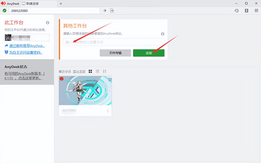 2.在受控端同样有一个Anydesk地址,将受控端的Anydesk地址输入到这个会话框内,点击连接。