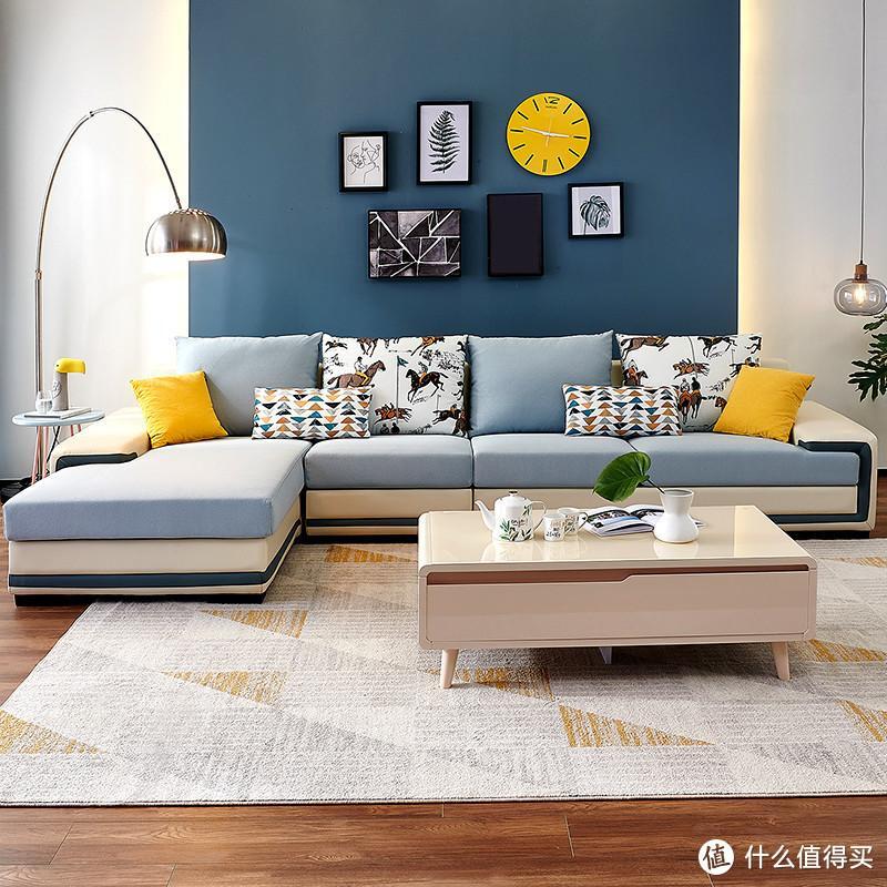对于喜欢清新色调,注重舒适性的年轻用户,我推荐这款全友布艺沙发,它有着很鲜明的特色,不同颜色对应不同面料,将选择权交给用户,【水蓝+米白】配色对应【机织布+仿皮】材质,【浅灰+深灰】配色对应【仿棉麻+仿皮】材质,【浅灰+灰蓝】配色对应【科技布】材质,其中我最喜欢的便是这“水蓝+米白”款,它将皮沙发的高档触感和布艺的舒适体验完美融合到一起。