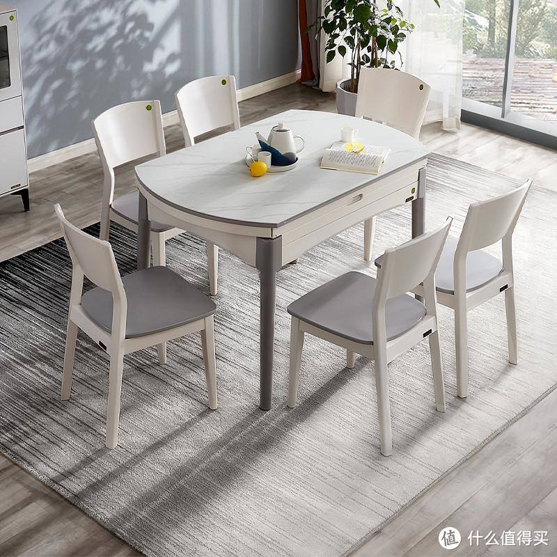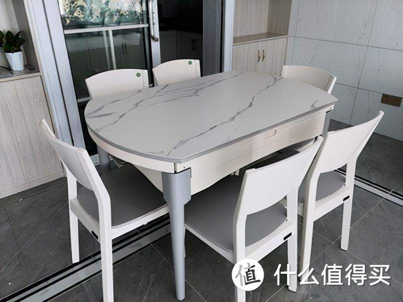另外,这款餐桌的桌面还贴心地提供岩板和玻璃两种材质可选。这里说说我非常看好的岩板材质,岩板桌面近几年非常流行,主要是因为它的优点非常多,耐污渍、易清洗、防刮花、耐高温全具备了。