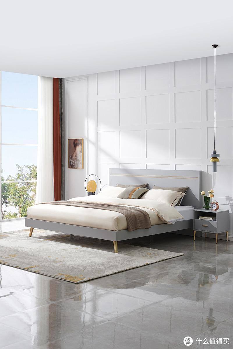 这款床架提供时尚灰、银白灰两色可选,床屏巧妙地采用金元素点缀,打破沉闷,让你眼前一亮,床屏顶部设有置物台,闹钟、眼镜、纸巾随用随拿,方便极了。