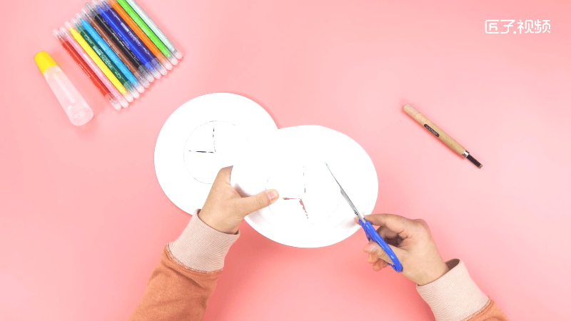 1、用画笔分别在2个纸盘上画圆,用美工刀在在纸盘中间画个十字,然后剪下这个圆;