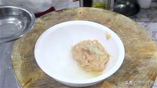 加入食盐,鸡粉,胡椒粉,料酒,加点一点清水,快速搅拌上劲,利用搅拌摩擦,撕裂蛋白质,让肉泥更好的吸收水分和调料。