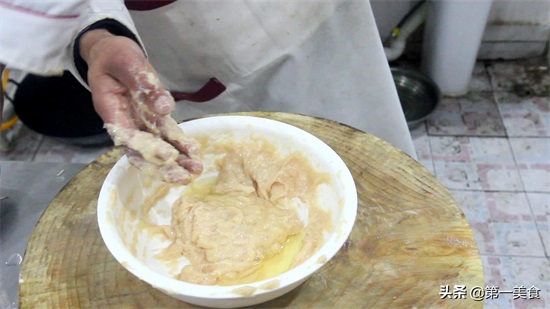 如此反复搅拌的目地,主要是为了给肉泥上浆上劲,才能入口更劲道。打好的肉泥比较细腻,比重变轻。